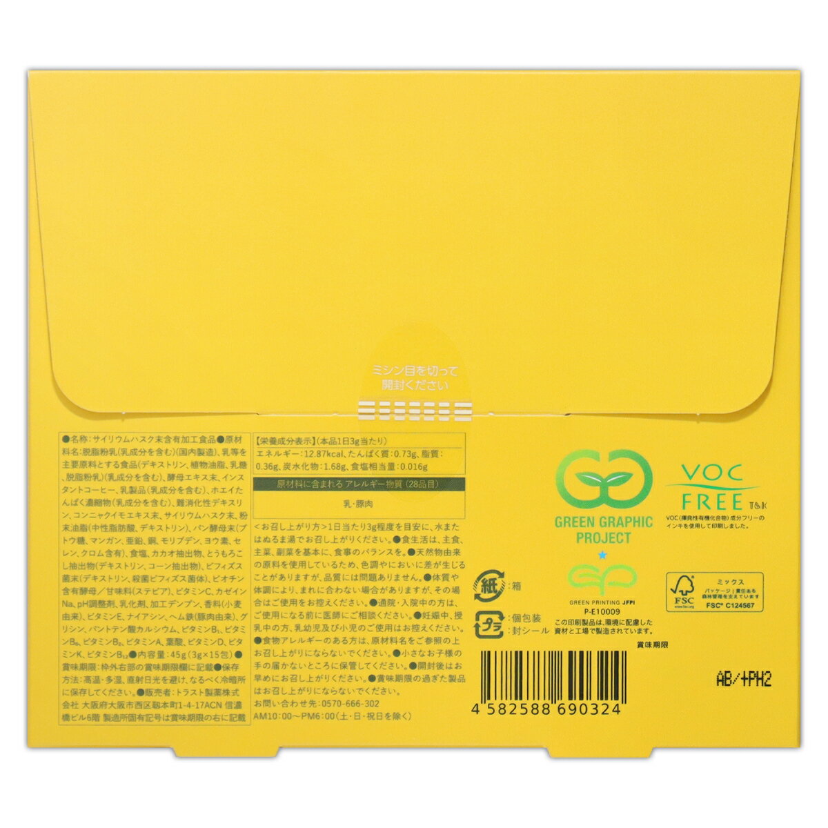 【名称】 サイリウムハスク未含有加工食品 【一日摂取目安量】 3g 【内容量】 45g(3g × 15包) 【お召し上がり方】 水またはぬるま湯などでお召し上がりください。