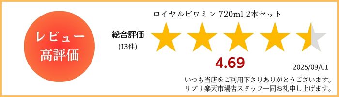 ) 返品・交換 返品(返金・交換)について ラインナップロイヤルビワミン 720ml3,456円(税込)翌日配送「あす楽」対応商品詳細ページへロイヤルビワミン 720ml 2本セット 希釈ボトルプレゼント付6,912円(税込)ポイント3倍翌日配送「あす楽」対応商品詳細ページへロイヤルビワミン 希釈用ボトル5〜8倍の目盛り付き。