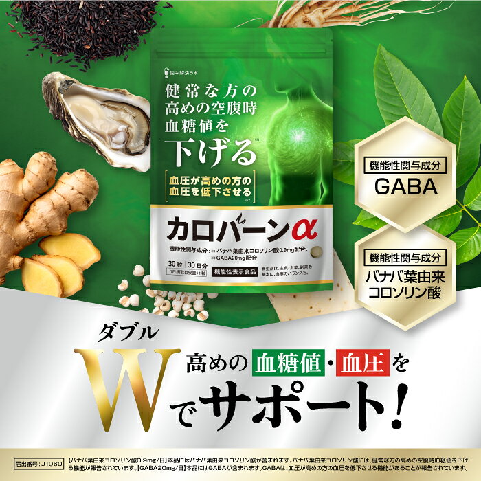 🌱【高めの 血糖値 血圧 をWサポート】カロバーンαは健常な方の高めの空腹時血糖値を下げる機能が報告されているバナバ葉由来コロソリン酸、及び血圧が高めの方の血圧を低下させる機能があることが報告されているGABAを主成分とした 血糖値 血圧 をダブルでサポートするサプリメントです。
