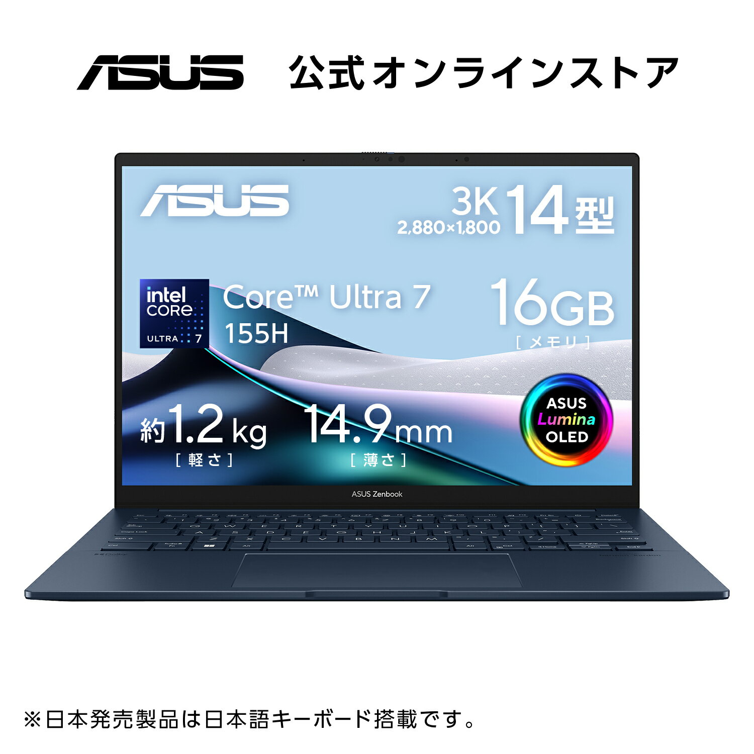 製品名 ASUS Zenbook 14 OLED UX3405MA 型番 UX3405MA-U7161WS 本体カラー ポンダーブルー OS ※1 Windows 11 Home 64ビット CPU CPU名:インテル Core Ultra 7 プロセッサー 155H 動作周波数:P-core 最大4.8GHz (6コア) / E-core 最大3.8GHz (8コア) / LP E-core 最大2.5GHz (2コア) キャッシュメモリ:インテル スマート・キャッシュ 24MB AI機能:インテル AI Boost (NPU AI エンジン) メインメモリ 標準/最大 ※2:16GB/16GB 仕様:LPDDR5X-7467 スロット:オンボードメモリのみ 表示機能 ディスプレイ:14.0型 OLED (有機EL) ※3 表面仕様:グレア 解像度:2,880×1,800ドット (120Hz) 視野角:水平170°/垂直170° タッチパネル:非搭載 グラフィックス機能:インテル Arc グラフィックス (CPU内蔵) ビデオメモリ ※4:メインメモリと共有 外部ディスプレイ出力 ※5:最大7,680×4,320ドット 記憶装置 SSD ※6:1TB (PCI Express 4.0 x4接続 NVMe/M.2) サウンド機能 サウンド規格:ハイ・デフィニション・オーディオ準拠 スピーカー:ステレオスピーカー内蔵 (1W×2) マイク:アレイマイク内蔵 Webカメラ 207万画素赤外線 (IR) カメラ内蔵 ※7 Windows Hello 顔認証対応 通信機能 LAN:- 無線LAN ※8:IEEE802.11a/b/g/n/ac/ax (Wi-Fi 6E) Bluetooth 機能:Bluetooth 5.3 入力機能 キーボード:84キー日本語キーボード (イルミネートキーボード) (JIS配列) ポインティングデバイス:マルチタッチ・タッチパッド インターフェース ディスプレイ出力:HDMI×1 USBポート:Thunderbolt 4 (Type-C) ※9×2、USB3.2 (Type-A/Gen1) ×1 カードリーダー:- オーディオ:マイクロホン/ヘッドホン・コンボジャック×1 電源 Type-C/65W ACアダプター (20V/3.25A) またはリチウムポリマーバッテリー (4セル/75Wh) バッテリー バッテリー駆動時間 (JEITA測定法2.0) ※10:約21.0時間 バッテリー駆動時間 (JEITA測定法3.0) ※11:約11.4時間 (動画再生時) /約20.0時間 (アイドル時) バッテリー充電時間:約2.1時間 消費電力 消費電力:最大約65W エネルギー消費効率 ※12:12区分 16.9kWh/年 (AAA) 質量 サイズ (突起部除く):幅312.4mm×奥行き220.1mm×高さ14.9mm 質量:約1.2kg 保証期間 本体:購入日より12ヶ月間のインターナショナル保証+購入日より12ヶ月間のASUSのあんしん保証 (日本国内保証・要登録) ※13 バッテリーおよびACアダプター:購入日より12ヶ月間の日本国内保証 ビジネス統合アプリ Microsoft Office Home and Business 2021 (デジタルアタッチ版) ※15 + Microsoft 365 Basic (1年間使用権) ※16 Xbox Game Pass Xbox Game Pass Ultimate (3ヶ月利用権) ※17 主な付属品 ACアダプター、製品マニュアル、製品保証書 備考 ※1. プリインストールされているOS以外はサポート対象外となります。