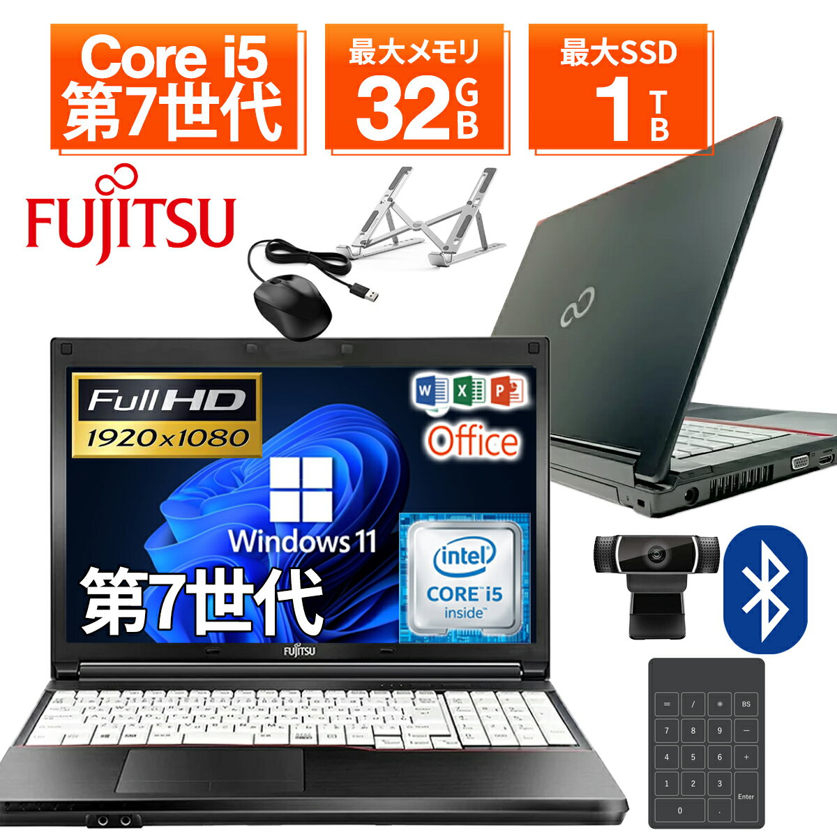 商品特徴 【WEBカメラ+テンキー付き】中古ノートパソコン 中古パソコン 15.6インチ SSD1TB メモリ32GB Core i5 第7世代 Microsoft Office付き Windows11 富士通 FMV LIFEBOOK A577 ノートパソコン 中古 PC パソコン 中古ノートPC 中古ノート 最大SSD1TB 最大メモリ32GB 商品名 富士通 FMV LIFEBOOK A577 Core i5第7世代フルHDの大画面で搭載機能豊富なノートパソコン! ディスプレイ 15.6インチワイド⇒大画面で見やすいノングレアフルHD!! 搭載OS Windows11 Pro 64bit⇒最新OS搭載! CPU Intel Core i5-7200U⇒ビジネスでも活躍可能な高性能CPU! ストレージ SSD128GB~1TBオプションで変更可能 メモリ メモリ4~32GB ⇒複数作業も重い処理も問題なし! WEBカメラ 搭載 DVDドライブ 非搭載 テンキー 搭載 外部接続端子 USB3.0有線LANHDMI端子 付属Officeソフト WPS Office OR 赤字覚悟の Microsoft Office 2019 保証について 30日間修理交換保証(レビュー記入で180日間延長) 付属品 ACアダプター新品有線マウスPCスタンド 注意事項 バッテリーは消耗品のためバッテリーの劣化は保証対象外となります。