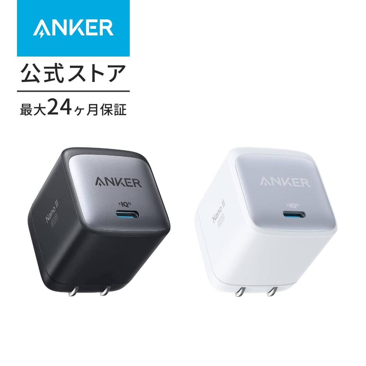 (※充電時間はAnker調べです) •パッケージ内容:Anker Nano II 45W、取扱説明書、最大24ヶ月保証 (※正規販売店からの注文に限り18ヶ月保証の対象となり、条件付きで+6ヶ月の延長保証が付きます。