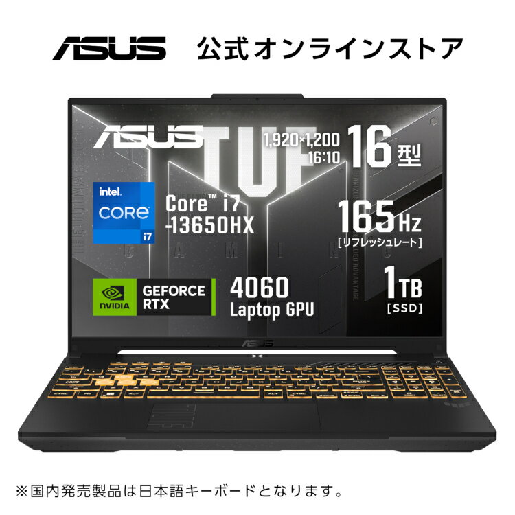 製品名 ASUS TUF Gaming F16 FX607JV 型番 FX607JV-I7R4060 本体カラー イェーガーグレー OS ※1 Windows 11 Home 64ビット CPU CPU名:インテル Core i7-13650HX プロセッサー 動作周波数:P-core 最大4.9GHz (6コア) / E-core 最大3.6GHz (8コア) キャッシュメモリ:インテル スマート・キャッシュ 24MB チップセット インテル® HM770 メインメモリ 標準/最大 ※2:16GB/32GB 仕様:DDR5-4800 スロット:SODIMMスロット×2 (空き×1) 表示機能 ディスプレイ:16.0型ワイドTFTカラー液晶 表面仕様:ノングレア 解像度:1,920×1,200ドット (165Hz) 視野角:水平170°/垂直170° タッチパネル:非搭載 グラフィックス機能:NVIDIA GeForce RTX 4060 Laptop GPU (NVIDIA Optimus Technology対応) (最大130W) ビデオメモリ ※3:GDDR6 8GB 外部ディスプレイ出力 ※4:最大7,680×4,320ドット 記憶装置 SSD ※5:1TB (PCI Express 4.0 x4接続 NVMe/M.2) サウンド機能 サウンド規格:ハイ・デフィニション・オーディオ準拠 スピーカー:ステレオスピーカー内蔵 (2W×2) マイク:アレイマイク内蔵 Webカメラ 92万画素Webカメラ内蔵 通信機能 LAN:1000BASE-T/100BASE-TX/10BASE-T (RJ45) 無線LAN ※6:IEEE802.11a/b/g/n/ac/ax (Wi-Fi 6) Bluetooth®機能:Bluetooth® 5.2 入力機能 キーボード:106キー日本語キーボード (RGB イルミネートキーボード) (JIS配列) ポインティングデバイス:マルチタッチ・タッチパッド インターフェース ディスプレイ出力:HDMI×1、Type-C×2 USBポート:Thunderbolt 4 (Type-C) ※7 ×1、USB3.2 (Type-C/Gen2/Power Delivery対応) ※8 ×1、USB3.2 (Type-A/Gen1) ×2 カードリーダー:- オーディオ:マイクロホン/ヘッドホン・コンボジャック×1 セキュリティスロット 搭載 電源 Φ6.0/240W ACアダプター (20V/12A) またはリチウムポリマーバッテリー (4セル/90Wh) バッテリー バッテリー駆動時間 (JEITA測定法3.0) ※9:約8.0時間 (動画再生時) /約16.2時間 (アイドル時) バッテリー駆動時間 (JEITA測定法2.0) ※10:約14.5時間 バッテリー充電時間:約1.8時間 消費電力 消費電力:最大約240W エネルギー消費効率 ※11:12区分 27.9kWh/年 (88%) 質量 サイズ (突起部除く):幅354.9mm×奥行き251.9mm×高さ22.15~28.25mm 質量:約2.27kg 保証期間 本体:購入日より12ヶ月間のインターナショナル保証+購入日より12ヶ月間のASUSのあんしん保証 (日本国内保証・要登録) ※12 バッテリーおよびACアダプター:購入日より12ヶ月間の日本国内保証 Xbox Game Pass PC Game Pass (3ヶ月利用権) ※13 主な付属品 ACアダプター ※14、製品マニュアル、製品保証書 備考 ※1. プリインストールされているOS以外はサポート対象外となります。