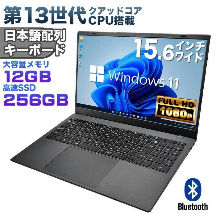 【新品】第13世代クアッドコアCPU搭載 Windows11 ノートパソコン 15.6インチワイド液晶 フルHD Intel AlderLake N95 メモリ12GB DDR4 新品SSD256GB NVMe PCIe3.0 USB3.0 HDMI JIS・日本語配列キーボード ISO9001認定工場生産【DC接続】