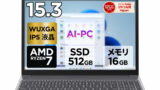 CPU AMD Ryzen™ 5 7530U プロセッサー チップセット APUに統合 指紋センサー あり メモリ 16GB DDR4-3200 SDRAM (オンボード)、(スロット0、空き0) ハードディスク なし 記憶装置 512GB SSD(PCIe NVMe/M.2) 光学ドライブ なし グラフィックス AMD Radeon™ グラフィックス インターフェース USBポート:Type-C:USB 3.2 Gen1x1(Powerdelivery対応、DisplayPort出力機能付き)、Type-A:USB 3.2 Gen1x2、HDMIx1、マイクロホン/ヘッドホン・コンボ・ジャックx1 有線LAN なし ワイヤレスLAN Wi-Fi 6対応 (IEEE802.11ax/ac/a/b/g/n準拠) 内蔵Bluetooth Bluetooth v5.2 オーディオ機能 Dolby Audio™ 対応 スピーカー ステレオスピーカー(1.5Wx2) マイクロフォン デジタルアレイ マイクロホン 内蔵カメラ あり (前面:FHD 1080p カメラ、プライバシーシャッター付き) メディアカードリーダー 4-in-1メディアカードリーダー (SD、SDHC、SDXC、MMC) キーボード 日本語キーボード(バックライト付) 本体カラー アークティックグレー 本体寸法 (W×D×H)mm 約 324.3x213.8x17.9mm 本体質量 約 1.37kg バッテリー 固定式 3セル リチウムイオンポリマーバッテリー 47Whr使用時間(JEITA2.0):約 13.7時間 マイクロソフトOffice なし 主な付属品 ACアダプター、電源コード 保証 (選択) 1年間 引き取り修理/3年間 引き取り修理 ※上記仕様以外への変更、カスタマイズは承っておりませんのでご了承ください。