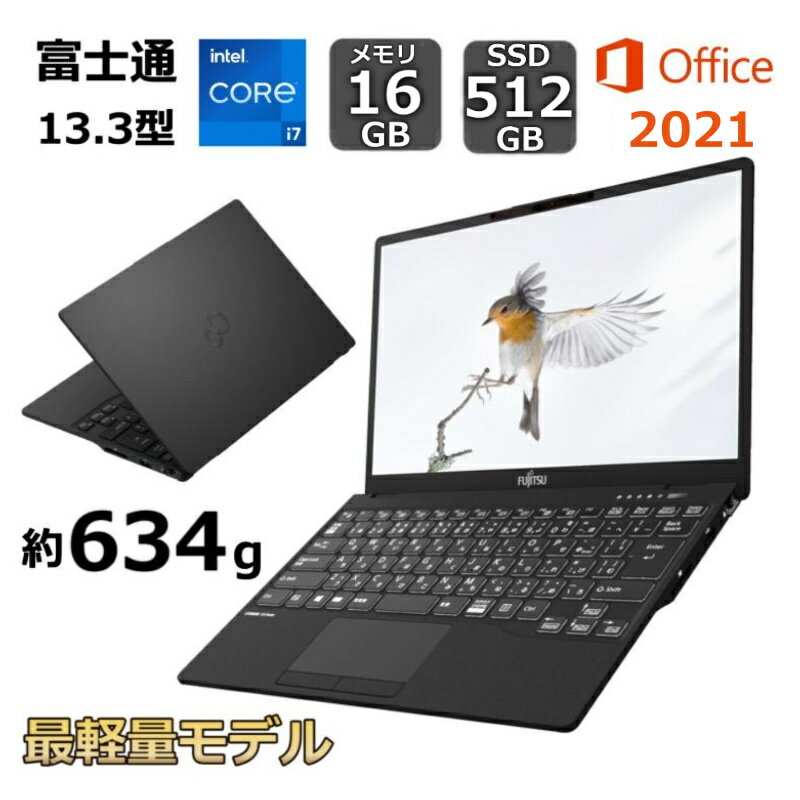 商品説明メーカー 富士通 FUJITSU スペック 【基本スペック】 ★液晶サイズ : 13.3 インチ LEDバックライト付高輝度・高色純度・広視野角TFTカラーLCD(ノングレア液晶) ★解像度 : フルHD (1920x1080) ★ワイド画面 : ○ ★OS: Windows 11 Pro 64bit ★Office詳細: Microsoft Office Home & Business 2021 ★CPU: 第11世代 インテル Core i7 1165G7(Tiger Lake) 2.8GHz/4コア ★グラフィック: Intel Iris Xe Graphics ★ストレージ容量 SSD:512GB ★メモリ容量: 16GB ★光学ドライブ: 無し ★無線LAN: Wi-Fi 6E(2.4Gbps)対応 IEEE802.11a/b/g/n/ac/ax + Bluetooth5.1 ★LAN: 10/100/1000Mbps ★生体認証: 指紋認証 ★インターフェース: HDMIx1/ USB 3.2(Gen1) Type-A×2/ USB3.2 Gen2 Type-Cx2/ SDスロット ★WEBカメラ: HD Webカメラ内蔵(プライバシーカメラシャッターー付)(有効画素数約92万画素) ★駆動時間: 約11 時間 ★幅x高さx奥行: 307x15.5x197 mm ★重量: 0.634 kg ★カラー: ピクトブラック 商品概要 商品の特長 ●もっと身軽に、コンパクトに 毎日気兼ねなく持ち運べる世界最軽量のコンパクトさを実現。
