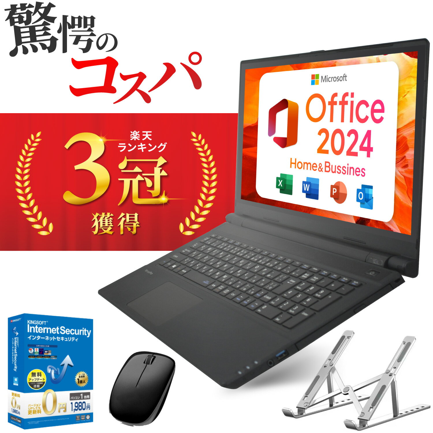 WEBカメラ 搭載 テンキー 搭載 外部接続端子 USB3.0(type-A)×3 SDカードスロット HDMI端子×1 有線LAN 光学ドライブ CD/DVD(再生専用) 付属品 ACアダプタースタートアップガイドセキュリティソフト新品無線マウスノートパソコンスタンド液晶クロス オススメポイント ★Microsoft Office 2024 H&B付き Word、Excel、PowerPointをご使用可能です。