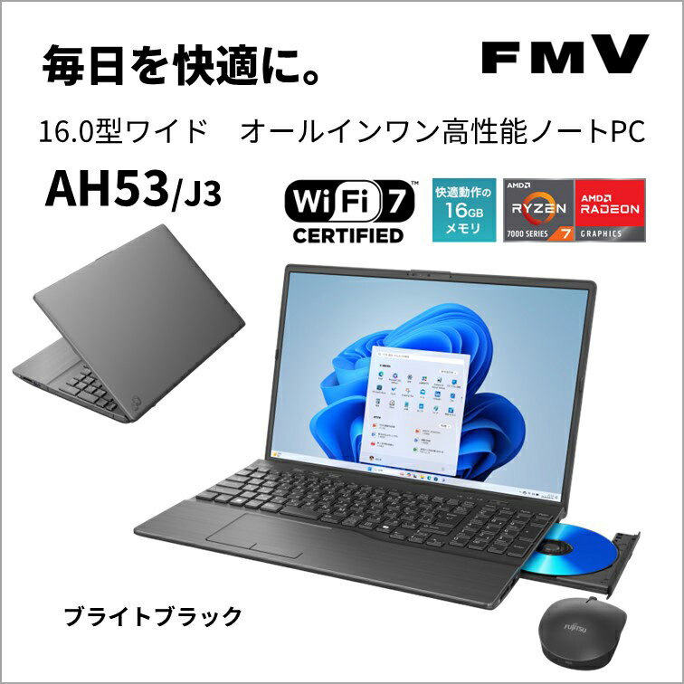 ■ 仕 様 ■OS : Windows 11 Homeディスプレイ … ・サイズ : 16.0型 ・パネル : ワイド(狭額縁)スーパーファイン液晶 ・解像度 : 1920×1200ドットCPU : AMD Ryzen 7 7735U プロセッサ(2.7GHz/最大4.75GHz、8コア/16スレッド)NPU : -グラフィックス : AMD Radeon 680Mメモリ(標準/最大) : 16GB(デュアルチャネル対応)/最大64GB DDR5-4800ストレージ : 約512GB SSD(PCIe Gen4)Webカメラ : フルHD Webカメラ(プライバシーカメラシャッター付)(有効画素数 約207万画素)文字入力 : プリズムクリアキーボード(テンキー付)(キーピッチ 約18.4mm/キーストローク 約2.5mm/押下圧 3段階/Copilot キー搭載)光学ドライブ : BDXL対応Blu-ray Discドライブ(スーパーマルチドライブ機能対応)無線通信機能 : Wi-Fi (7 5.76Gbps対応)、Bluetoothサウンド : Dolby Atmosメモリースロット : SDメモリーカード対応インターフェース … ・USB(Type-C)左側:USB4(Gen3)×1USB 3.(2 Gen2)×1( USB Power Delivery対応、DisplayPort Alt Mode対応) ・USB(Type-A)右側:USB 3.(2 Gen1) ×1 左側:USB 3.2(Gen2) ×1 ・HDMI出力端子×1 ・RJ-45×1(有線LAN)電源 : ACアダプタまたはリチウムイオンバッテリーバッテリー駆動時間(JEITA 3.0) : 動画再生時 約5.1時間/アイドル時 約11.1時間バッテリー駆動時間(JEITA 2.0) : 約10.5時間消費電力(標準時/最大時/スリープ時) : 約10W/約65W/約1.7W省エネ法に基づくエネルギー消費効率 : 12区分 22.5kWh/年 (AAA)外形寸法(幅×奥行×高さ)(突起部含まず) : 360×243.5×26.8mm本体質量 : 約1.9kg特長 : モバイルバッテリー充電/ワンタッチボタンOffice : Microsoft 365 Basic+ Office Home & Business 2024主な付属品 : マニュアル類、ACアダプタ、BlueLED 静音マウス、保証書、単4形乾電池2本[FMVA53J3B]パソコン>パソコン本体>ノートパソコン>AMD Ryzen 7・まごころ長期修理保証(保証3年)[加入料:対象商品代金の5%]商品「FMVA53J3B」専用加入料(※加入料のみ注文不可)・まごころ長期修理保証(保証5年:免責1万)[加入料:対象商品代金の5%]商品「FMVA53J3B」専用加入料(※加入料のみ注文不可)※対象商品と専用加入料を分けてのご注文は承れません。