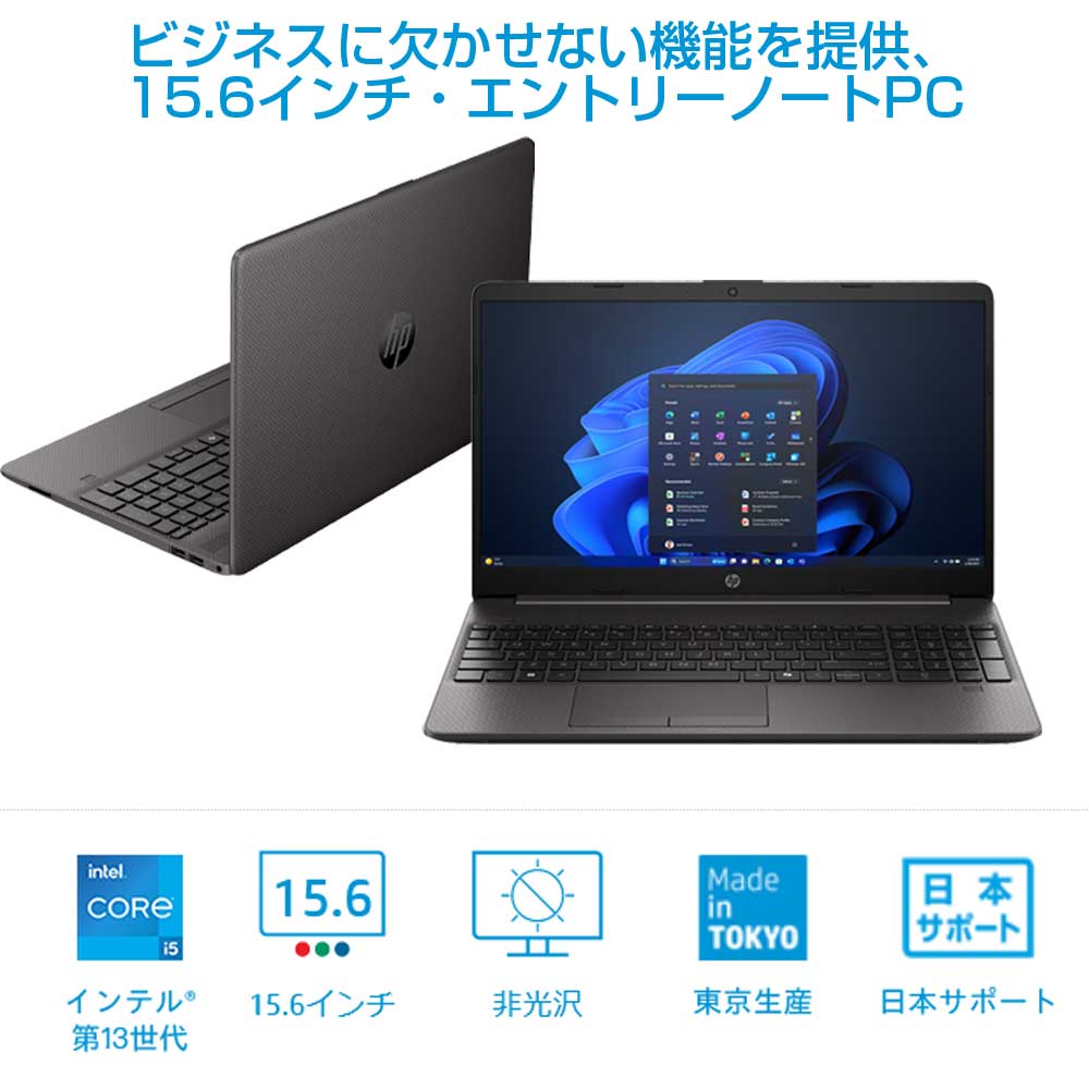 <ここがポイント>■ポイント1 「見やすいディスプレイ」・ビジネスや学習でも使いやすい大画面15.6型ディスプレイ・綺麗で見やすい、フルハイビジョン解像度(1920×1080)■ポイント2 「快適動作を実現」・インテル Core i5 1335U CPU 搭載、クロック周波数は最大4.60GHz・データ転送速度を向上するデュアルチャネルメモリ■ポイント3 「ビジネスも遊びも快適」・HDMI出力×1、USBポートx3の豊富なインターフェース・セキュアに起動、指紋認証センサー搭載 <詳細スペック> ■インストールOS Windows11Pro 64ビット(日本語) ■オフィスソフト なし ■CPU インテル Core i5-1335U 第13世代 プロセッサー 最大4.6GHzPコア:最大4.6GHz / Eコア:最大3.4GHz 10コア/12スレッド ■メモリ 16GB(8GB×2)DDR4-3200MHz SODIMM ■ストレージ 256GB M.2 SSD(PCIe NVMe) ■光学ドライブ なし ■グラフィックコントローラ インテル Iris Xeグラフィックス(プロセッサー内蔵) ■ディスプレイ 15.6インチワイド(16:9)フルHD 液晶ディスプレイ(非光沢、1920×1080ドット、300cd/m2、UWVA)、LEDバックライト ■有線LAN あり 1000BASE-T/100BASE-TX/10BASE-T ■無線 Wi-Fiあり IEEE 802.11ac/a/b/g/n/ax 対応 ■Bluetooth Bluetooth5 ■入力デバイス キーピッチ:18.7×18.7mm、キーストローク:1.5-1.7mm、JIS標準準拠・OADG準拠配列、テンキー付き ■ポインティングデバイス タッチパッド(マルチタッチジェスチャー対応) ■Webカメラ 720p HD Webカメラ ■その他 <インターフェース> ディスプレイ出力:HDMI 1.4 出力×1 USB端子: SuperSpeed USB Type-A 5Gbps signaling rate (USB 3.2 Gen1) ×2 SuperSpeed USB Type-C (10Gbps signaling rate 、USB Power Delivery、DisplayPort 1.4) x1 その他端子:コンボステレオヘッドフォン/マイクジャック×1RJ-45×1SDカードリーダー×1(SD/SDHC/SDXC対応) ■主な付属品 HP 45WスマートACアダプター、電源コード、保証書等 ■筐体カラー ブラック ■対象メーカー型番 9R4K9AV-AAAF ■商品状態 新品外装ダメージ※外装パッケージ箱に若干の傷及び汚れがある場合がございますが、未開封新品状態です。