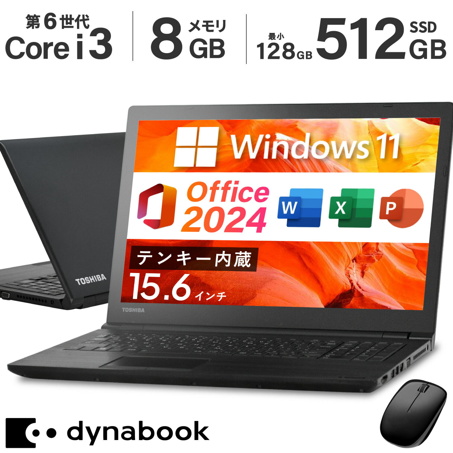 製 品 仕 様 型番 Microsoft Office 2024 H&B 搭載|中古 パソコン 中古ノートパソコン Windows11 Office付き|東芝 Dynabook B55 Core i3 第6世代|メモリ 8GB SSD 128GB 256GB 512GB|テンキー内蔵|無線マウス付属|中古PC ノートPC システム Windows 11 64bit CPU Core i3 第6世代 6006U 2GHz メモリ 8GB ストレージ SSD 128GB/256GB/512GB 液晶サイズ 15.6インチ 最大解像度 1366×768 光学ドライブ DVD-ROM 外部接続端子 USB3.0(type-A)×2USB2.0(type-A)×2HDMI端子×1VGA有線LAN WEBカメラ 非搭載 テンキー 搭載 無線LAN 内蔵または外付けUSB無線LANアダプタ Office Microsoft Office 2024 home&business インストール&認証済みすぐにお使い頂けます。