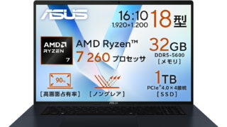 未分類 【1/9-16クーポン配布セール】5/2新発売 ノートパソコン メモリ 32GB SSD 1TB AMD Ryzen 7 260 18型144Hz Webカメラ 顔認証 Wi-Fi Bluetooth Type-C Power Delivery対応 Windows11 日本語キーボード PC Game Pass (3ヶ月利用権) ASUS Vivobook 18 M1807HA-R7321W