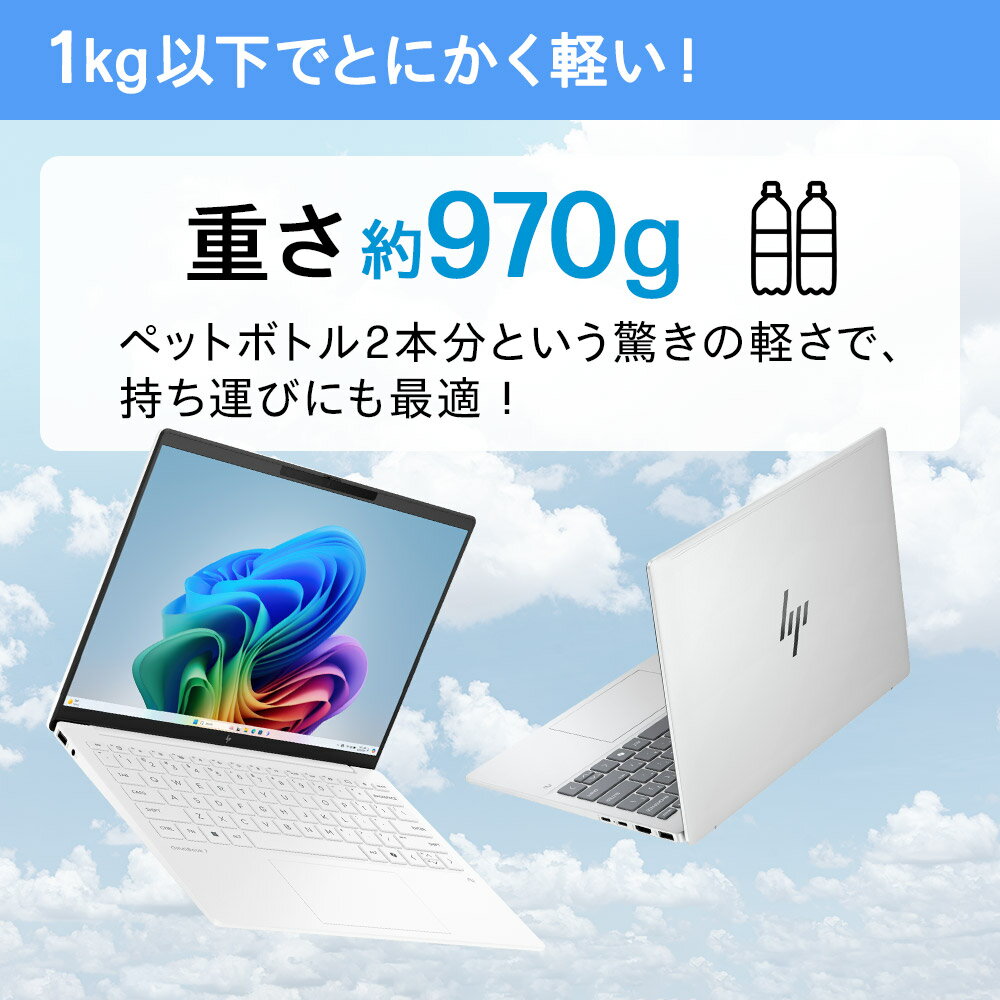 スペック モデル HP OmniBook 7 Aero 13-bg1000 シリーズ スタンダードモデル オペレーティングシステム Windows 11 Home プロセッサー AMD Ryzen™ AI 5 340 6コア/12スレッド・プロセッサー + Radeon™ グラフィックス NPU AMD Ryzen™ AI / 最大 50 TOPS カラー グレイシャーシルバー / セラミックホワイト メモリ 16GB オンボード (LPDDR5x-7500MT/s) ストレージ 512GB PCIe® Gen4 NVMe™ M.2 SSD Webカメラ 5MP IR カメラ (約500万画素) ネットワークコントローラー なし 内蔵無線LAN IEEE 802.11ax (Wi-Fi 6E)、Bluetooth 5.3 グラフィックスタイプ AMD Radeon™ 840M グラフィックス (プロセッサーに内蔵) ビデオメモリ メインメモリと共有 ディスプレイタイプ(液晶表示最大解像度/輝度/色域) 13.3インチワイド・WUXGA非光沢・IPSディスプレイ (1920×1200 / 400nit / sRGB 100% / 最大1677万色) 外部ディスプレイ 最大 3840×2160 ポインティングデバイス イメージパッド (タッチジェスチャー対応) キーボード バックライトキーボード(日本語配列) インターフェイス HDMI 2.1 出力端子×1、USB Type-C® 10Gbps ×2 (Power Delivery、DisplayPort™ 2.1、電源オフUSBチャージ機能対応)、USB Type-A 10Gbps ×1、USB Type-A 5Gbps ×1、ヘッドフォン出力/マイク入力コンボポート ×1 オーディオ Poly Studio デュアルスピーカー、内蔵デュアルマイク セキュリティ パワーオンパスワード、アドミニストレーターパスワード、TPM プライバシー機能 プライバシーカメラスイッチ、マイクミュートボタン搭載 Windows Hello 顔認証センサー サイズ(幅x奥行きx高さ) 約 297 × 211 × 16.5 -17.4 (最厚部) mm 質量 約 970 g ACアダプター 65W USB Type-C™ ACアダプター (動作電圧:100-240 VAC、動作周波数:50-60 Hz) 消費電力 (最大時) 最大 65W 省エネ法に基づくエネルギー消費効率 12区分 14.2kWh/年 (AAA) EPEAT Gold with Climate+ 登録済み バッテリ リチウムイオンバッテリ (3セル / バッテリーファストチャージ機能対応) バッテリ駆動時間 最大 15時間30分 セキュリティソフトウェア McAfee™+ プレミアム (30日版) オフィスソフト なし / Microsoft 365 Basic 12ヶ月試用版 + Office Home & Business 2024 (デジタルアタッチ版) 主なソフトウェア HP Support Assistant、HP AI Companion、その他 主な添付品 ACアダプター、電源コード、保証書 等 標準保証 1年間 (引き取り修理サービス、パーツ保証) 使い方サポート 1年間。