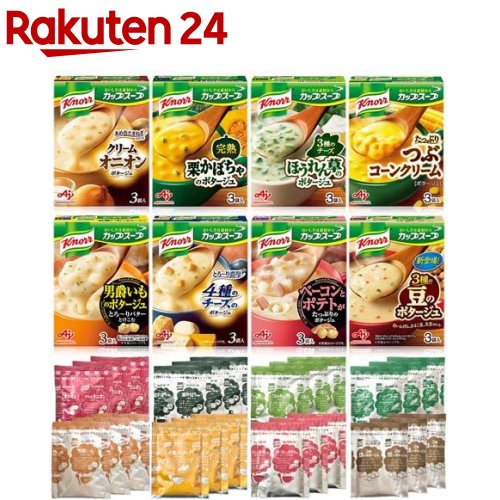 【セット詳細】ベーコンポテト、ほうれん草のポタージュ、栗かぼちゃ、4種のチーズ、つぶコーン、豆のポタージュ、クリームオニオン、男爵いも各1個(3袋入)【品名・名称】スープ【栄養成分】★ベーコンポテト1食(16.4g)あたりエネルギー:71kcal、タンパク質:1.4g、脂質:2.7g、炭水化物:10g、食塩相当量:1.1g★ほうれん草のポタージュ1食(13.4g)あたりエネルギー:61kcal、タンパク質:1.3g、脂質:3.2g、炭水化物:6.9g、食塩相当量:1.2g★栗かぼちゃ1食(18.8g)あたりエネルギー:82kcal、タンパク質:0.9g、脂質:2.9g、炭水化物:13g、食塩相当量:1.0g★4種のチーズ1食(17.9g)あたりエネルギー:82kcal、タンパク質:1.7g、脂質:4g、炭水化物:9.7g、食塩相当量:1.4g★つぶコーン1食(16.1g)あたりエネルギー:65kcal、タンパク質:1.0g、脂質:1.6g、炭水化物:12g、食塩相当量:1.0g★豆のポタージュ1食(18.6g)あたりエネルギー:78kcal、タンパク質:1.8g、脂質:2.8g、炭水化物:12g、食塩相当量:1.0g★クリームオニオン1食(18.1g)あたりエネルギー:83kcal、タンパク質:1.1g、脂質:3.9g、炭水化物:11g、食塩相当量:1.2g★男爵いも1食(17.6g)あたりエネルギー:76kcal、タンパク質:1.1g、脂質:2.8g、炭水化物:12g、食塩相当量:1.2g【アレルギー物質】★ベーコンポテト小麦・乳成分・大豆・鶏肉・豚肉★ほうれん草のポタージュ小麦・乳成分・大豆・鶏肉★栗かぼちゃ小麦・乳成分・大豆・鶏肉★4種のチーズ小麦・乳成分・大豆・鶏肉★つぶコーン小麦・乳成分・大豆・鶏肉★豆のポタージュ小麦・乳成分・大豆・鶏肉★クリームオニオン小麦・乳成分・大豆★男爵いも小麦・乳成分・大豆・鶏肉【保存方法】常温【発売元、製造元、輸入元又は販売元】味の素商品に関するお電話でのお問合せは、下記までお願いいたします。
