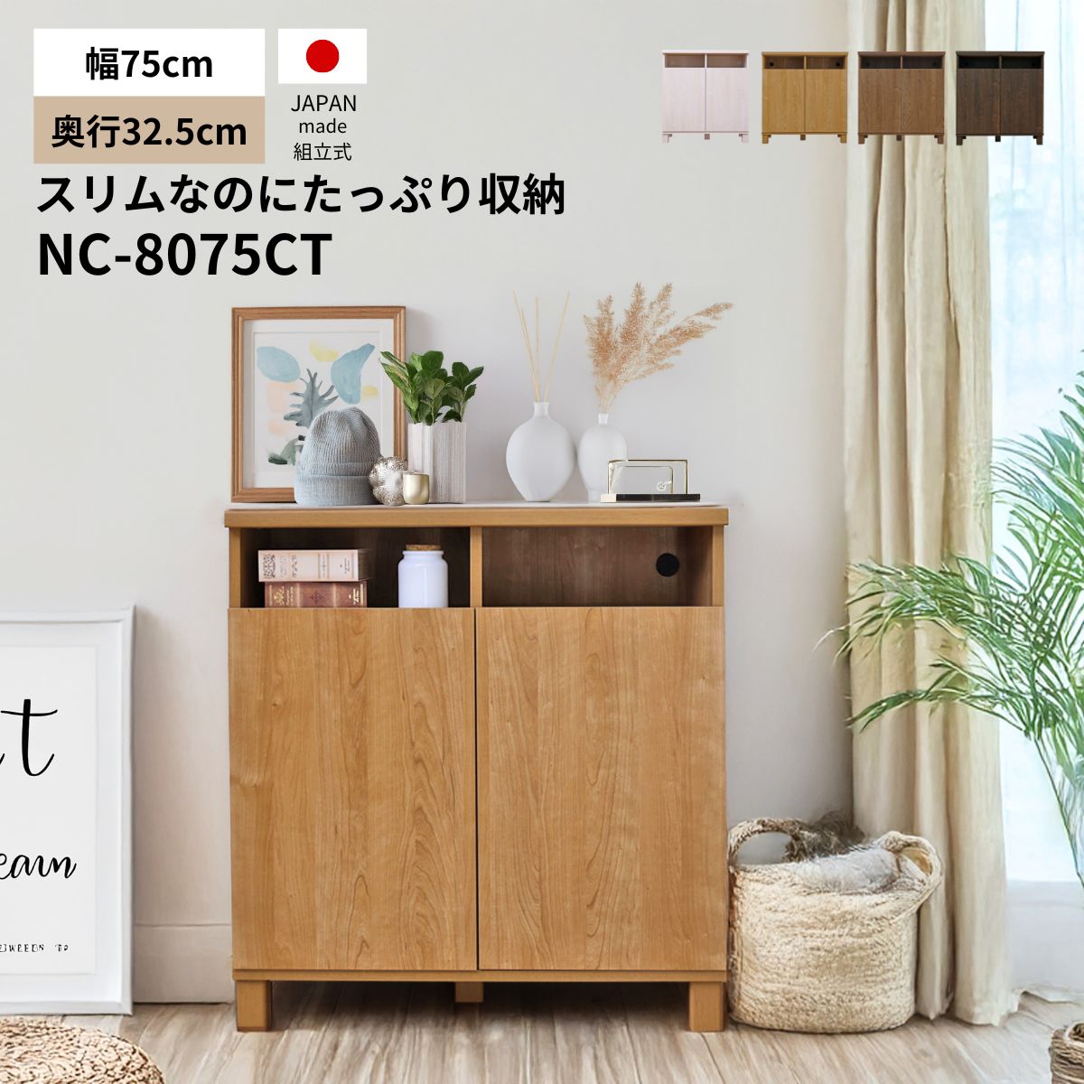 商品名 NC-8075CT カラー ナチュラル木目/ホワイト木目/ライトブラウン木目/ダークブラウン木目 サイズ 幅73.7 奥行32.5 高さ78.7(cm) 扉収納内寸:幅33.8 奥行27 高さ51.8(cm) (扉内の手前5cmは丁番がある為、幅30.8cm) オープン収納内寸:幅33.8 奥行27 高さ13(cm) 脚部:8cm ※組立家具を含む木材加工品は、組み立て方や設置環境によってサイズに誤差が生じる場合がございます。
