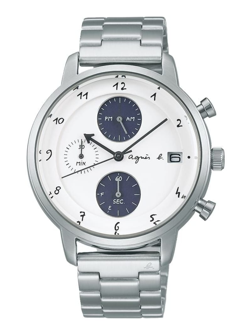 ホワイトのダイヤルに黒のインデックスと針、ステンレスシルバーのブレスレットバンドのこちらのデザインは、アニエスベーブティック限定モデルです。