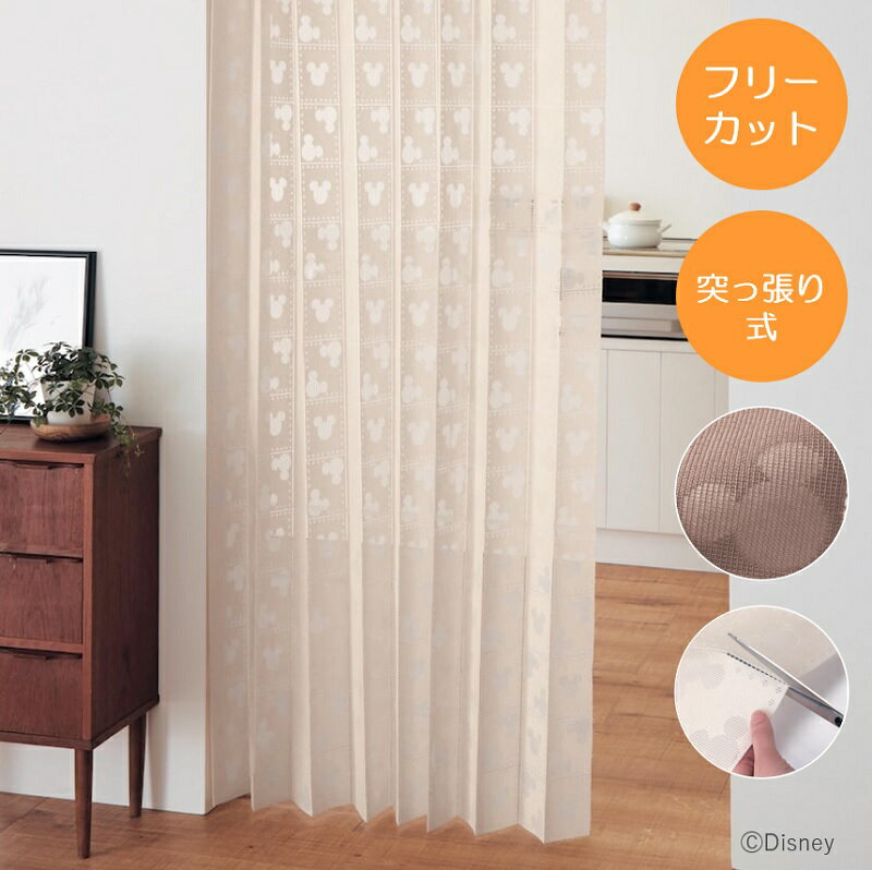 手軽に目隠しできて見た目もスッキリ ●人気のミッキーモチーフのロング目隠しカーテン。