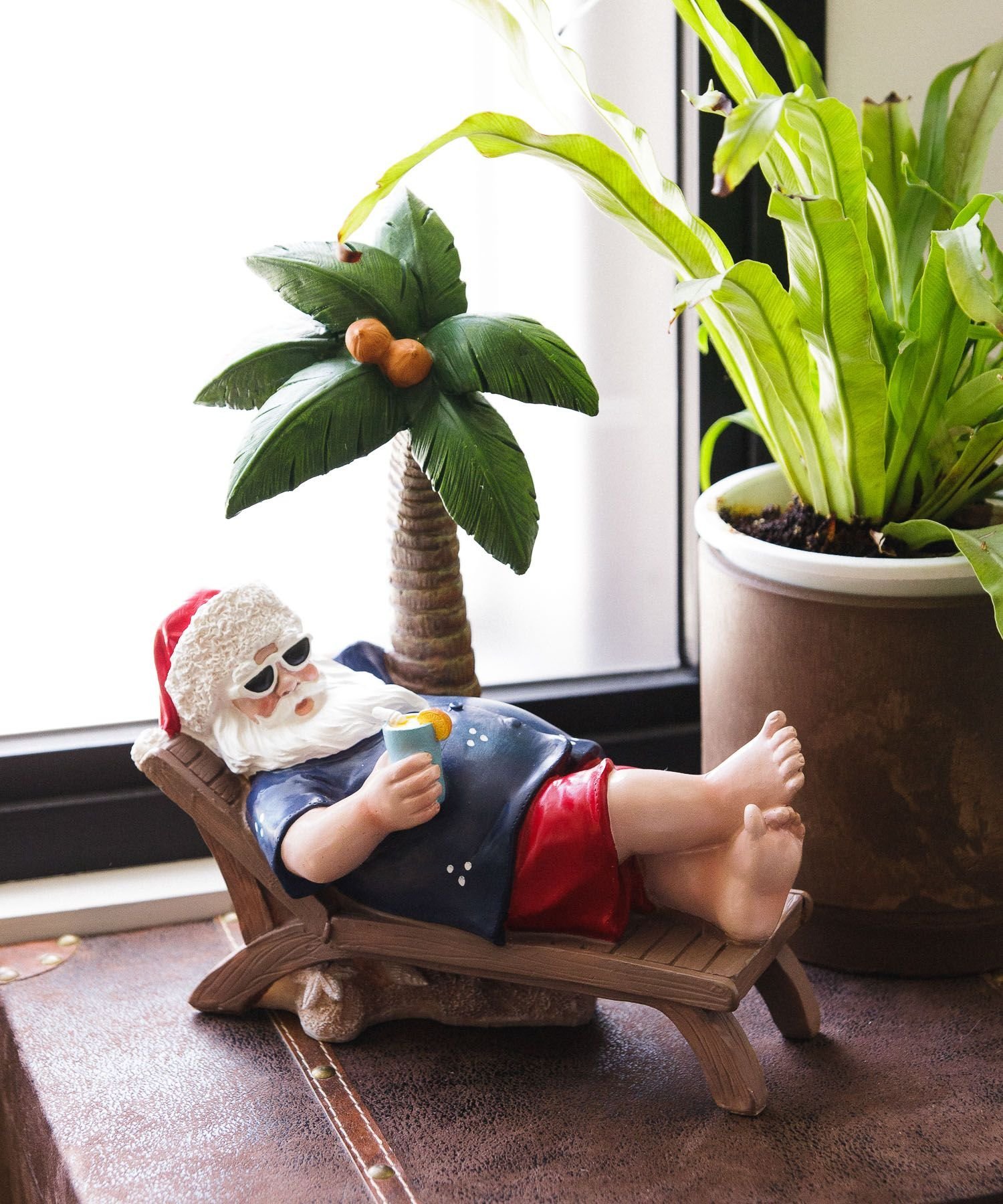 BAYFLOW(ベイフロー)チェアサンタオブジェ★2023X'mas★★BAYFLOW Christmas★クリスマスアイテムが今年も登場!ーーーヤシの木の側で日焼けを楽しむ、チャーミングなアロハ姿のサンタのオブジェ。