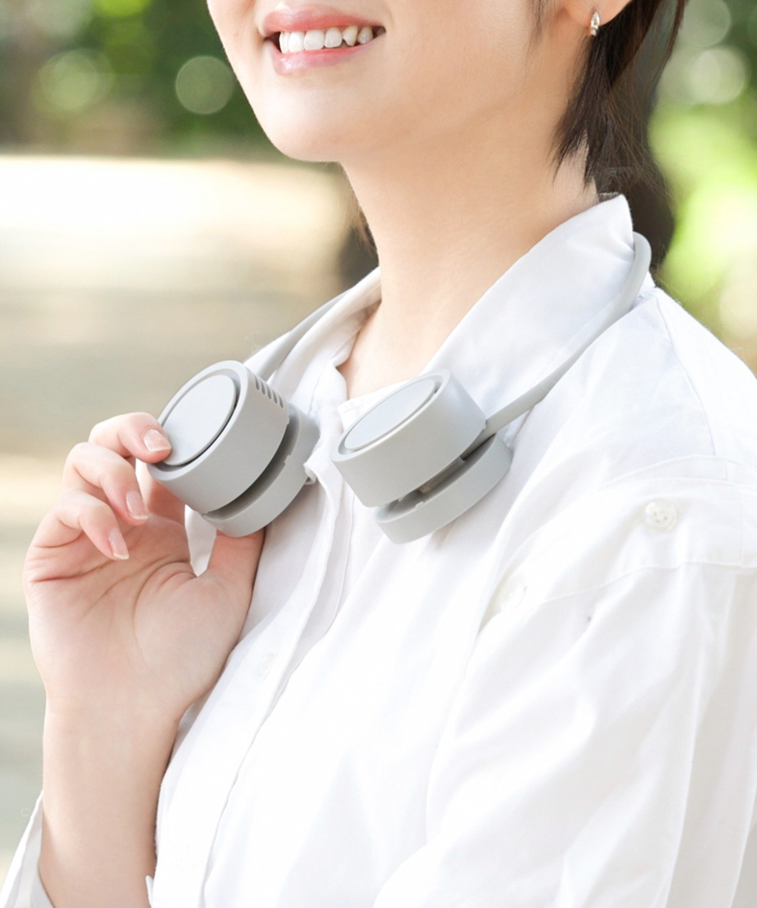 また羽根無しの安全な首掛けタイプの扇風機なので両手が空きとても便利!通勤・通学はもちろん、夏のおでかけや毎日の家事のお供にいかがでしょうか?持ち運びもくるくる巻いて充電ケーブルと一緒に付属のポーチにコンパクトに収納可能。