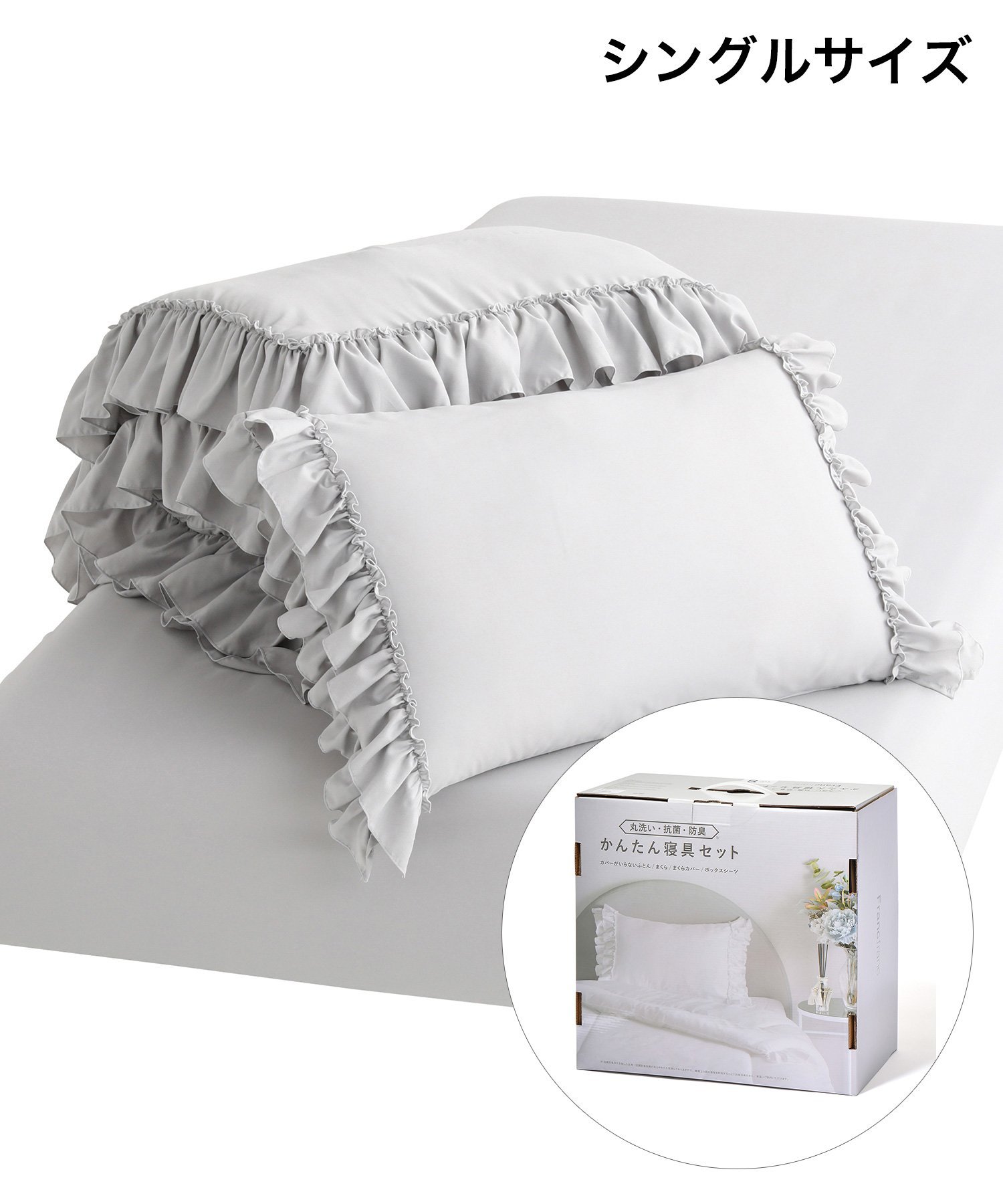 ラッピング・ギフト配送について同時に複数の商品を注文された場合メーカー希望小売価格についてご利用ガイドFrancfranc(フランフラン)かんたん寝具セット フリル シングル グレーすぐ使えてお手入れ簡単!寝具4点セットまくら・まくらカバー・掛け布団・ボックスシーツの寝具4点セットです。