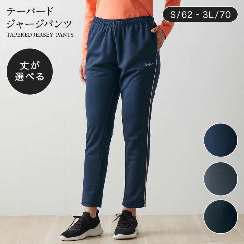 ブラック×ブラックネイビー×ピンクチャコール×ピンク —デザイン・スタイリング— ・女性らしいテーパードシルエット ・裾幅の細い九分丈で軽やか ・股上から前振りにカーブを描くパイピングでさりげなく細見せ ・かがんだ時も美しい見え方 ・後ろ股上を3cm深く設計し、背中や腰が出にくい仕様に ・身長に合わせた幅広いレングス展開 —素材— ・サラッと快適でムレにくい吸汗速乾素材 ・UVケアで気になる日差しもカバー (S)ウエスト(58〜64)、ヒップ(82〜90)、わたり幅30cm (M)ウエスト(64〜70)、ヒップ(87〜95)、わたり幅31cm (L)ウエスト(69〜77)、ヒップ(92〜100)、わたり幅32cm (LL)ウエスト(77〜85)、ヒップ(97〜105)、わたり幅33cm (3L)ウエスト(85〜93)、ヒップ(102〜110)、わたり幅34cm ●ウエスト:ゴムとひも通し●<カットソー>ポリエステル100%●中国製 ※ご家庭で洗濯ができます。